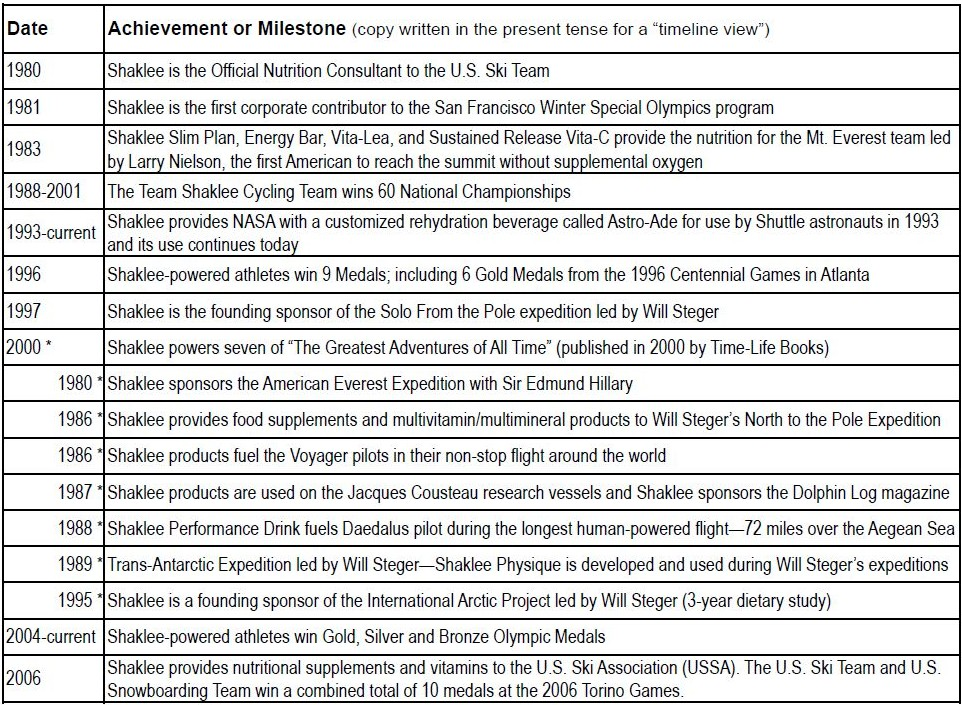 2006 | Shaklee provides nutritional supplements and vitamins to the U.S. Ski Association (USSA). The U.S. Ski Team and U.S. Snowboarding Team win a combined total of 10 medals at the 2006 Torino Games. |